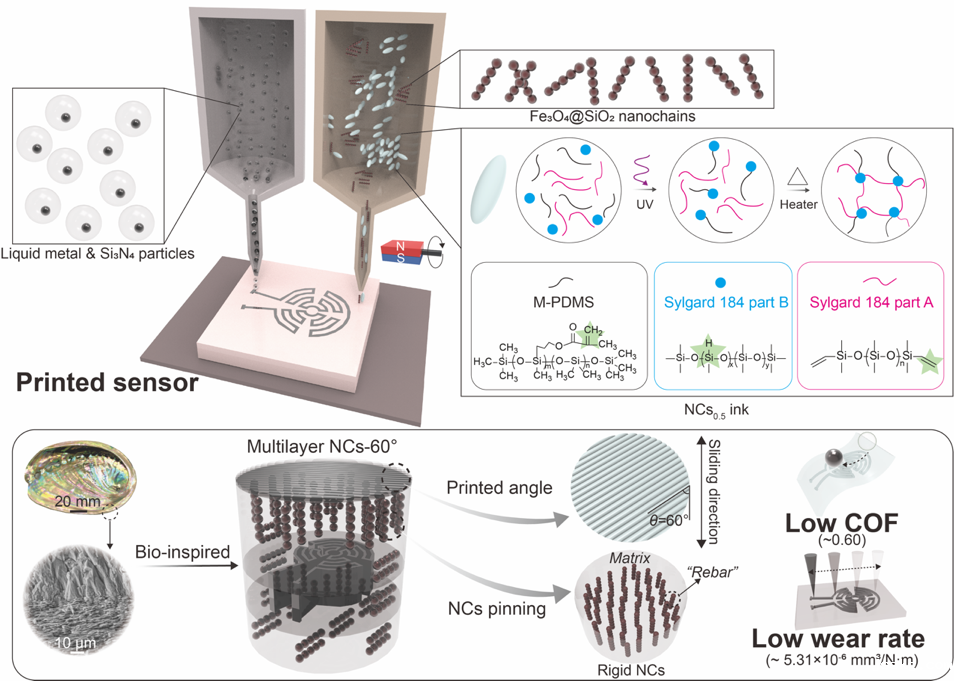 近年来,物联网、工业4.0、大数据、人工智能、机器人和数字健康等领域的进步,柔性可穿戴传感器引起了科研人员的大量关注。由于日常穿戴及运动过程产生的磨损继而引发其失效的问题仍然是制约其应用的关键因素之一。改变复合材料中增强颗粒的取向和分布可望提升机械负载方向的力学性能。然而,与牙齿、骨骼和贝壳等天然结构相比,其效果仍然很差。生物界中,鲍鱼具有坚韧的外壳能承受巨大的外力,外壳的珍珠层和棱柱层交叉排列提供了优异的力学性能,受此启发,仿照其结构制备在三维方向适应分布的复合材料,调控获得局部定制化使其兼具耐磨特性,并以此作为传感器的封装层,有望极大提升传感器的服役寿命。